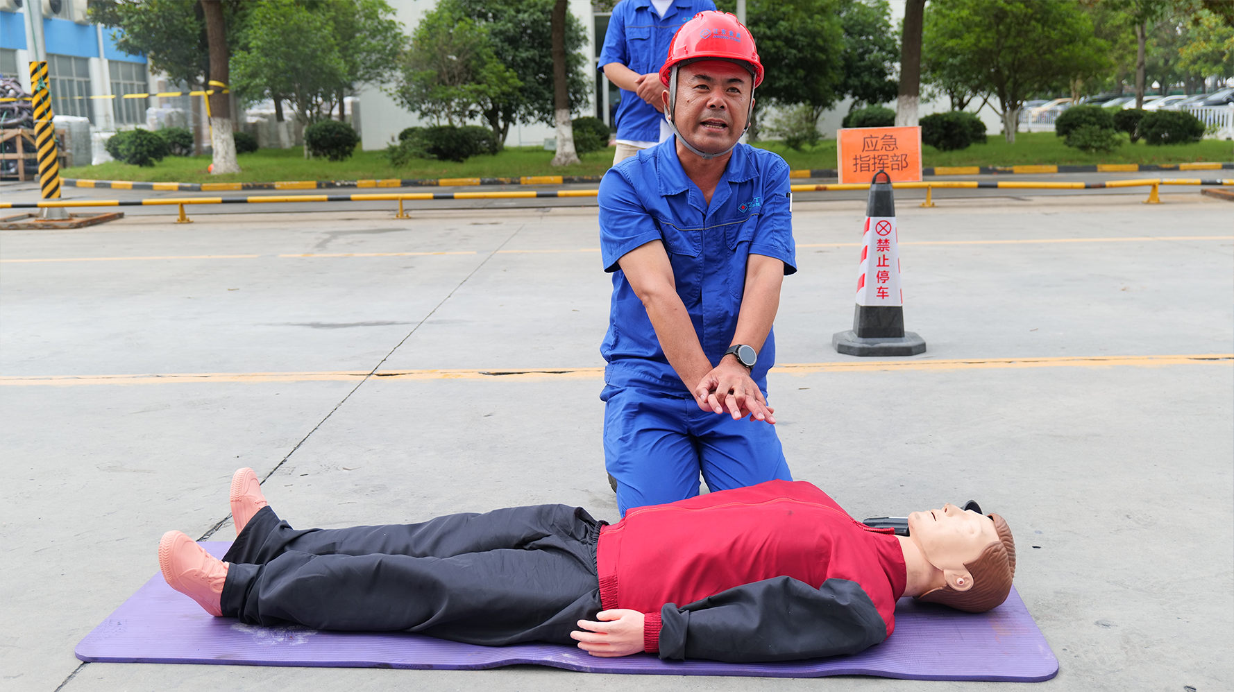 与此同时,救护人员把一名员工从车间抬出,由王文虬向大家演示人工呼吸和心肺复苏的方法与步骤;